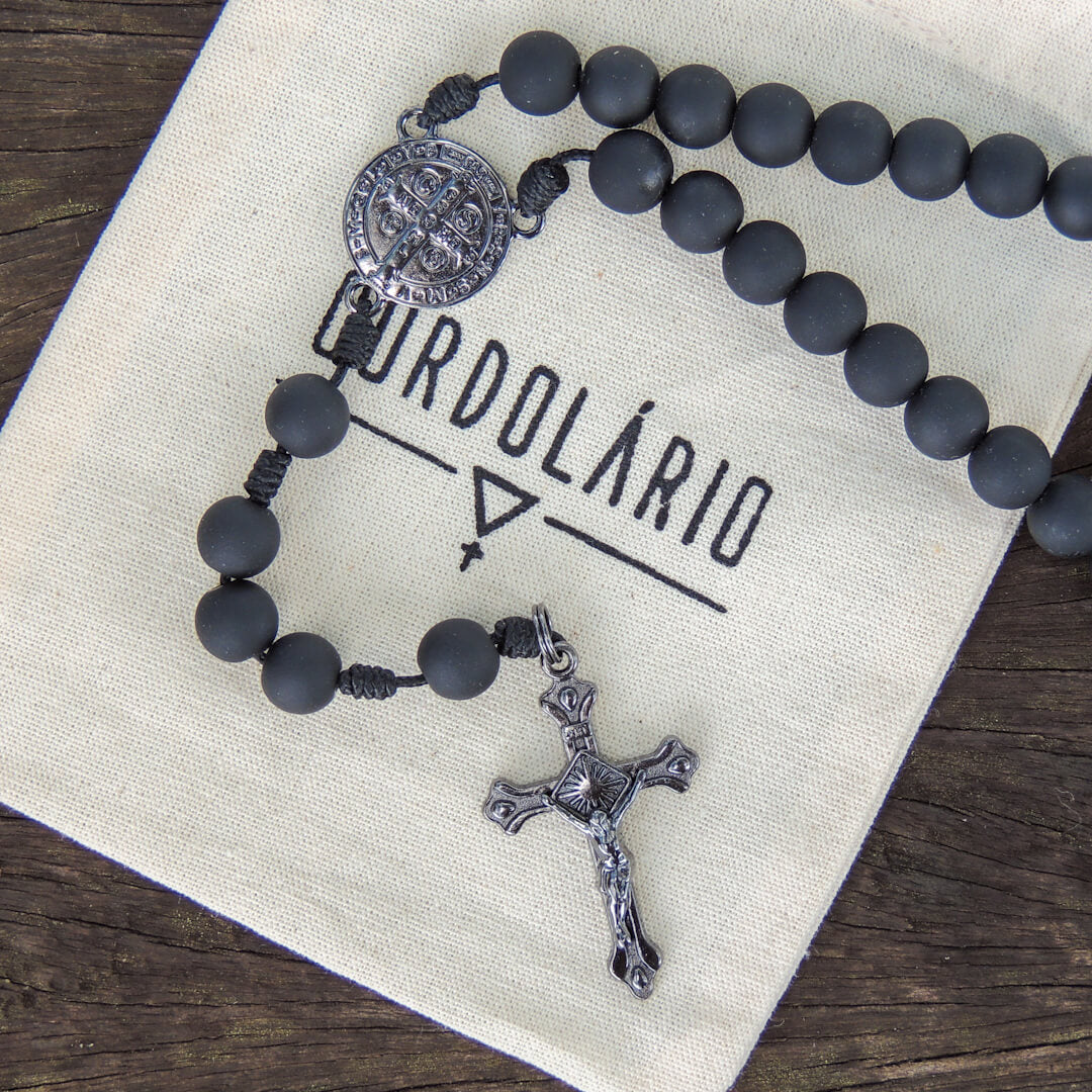 Terço feito com Microcord, um cordão resistente que não arrebenta com proteção UV e anti-mofo. As contas de resina ABS emborrachada de 10mm são leves e confortáveis. Inclui porta-terço de algodão cru exclusivo. Excelente opção para os devotos da Medalha de São Bento.